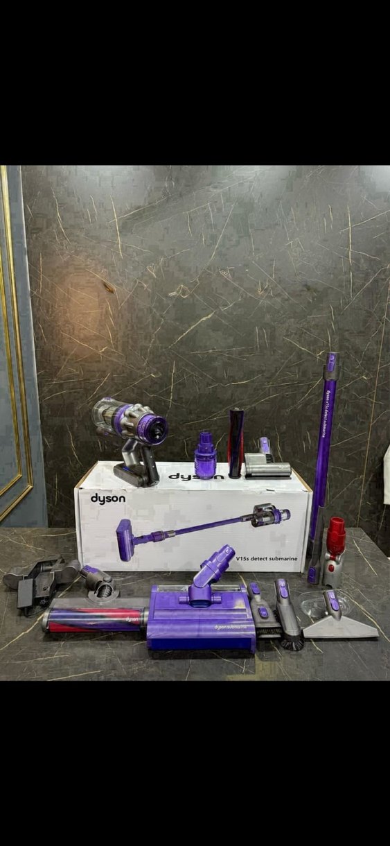 Çoklu başlıklar ve motorlu fırça içeren koyu mor Dyson kablosuz elektrikli süpürge. Orijinal kutu ve aksesuarlarla birlikte.