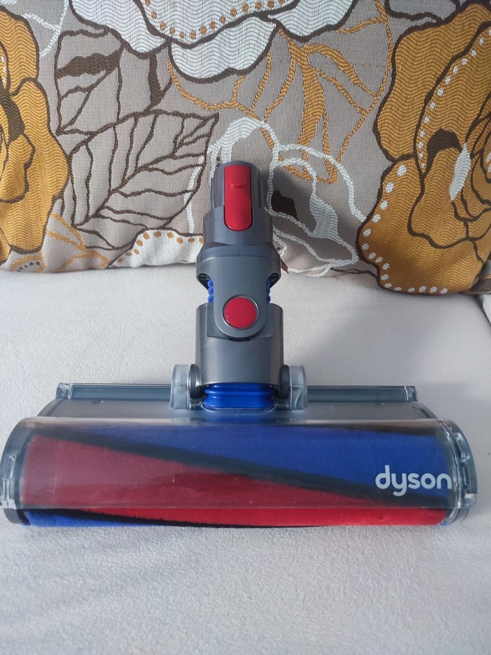 Dyson marka, gri ve kırmızı renkli elektrikli süpürge aparatı. Kullanımı kolay düğmeler ve fırçayı gösteren şeffaf kapak içerir.