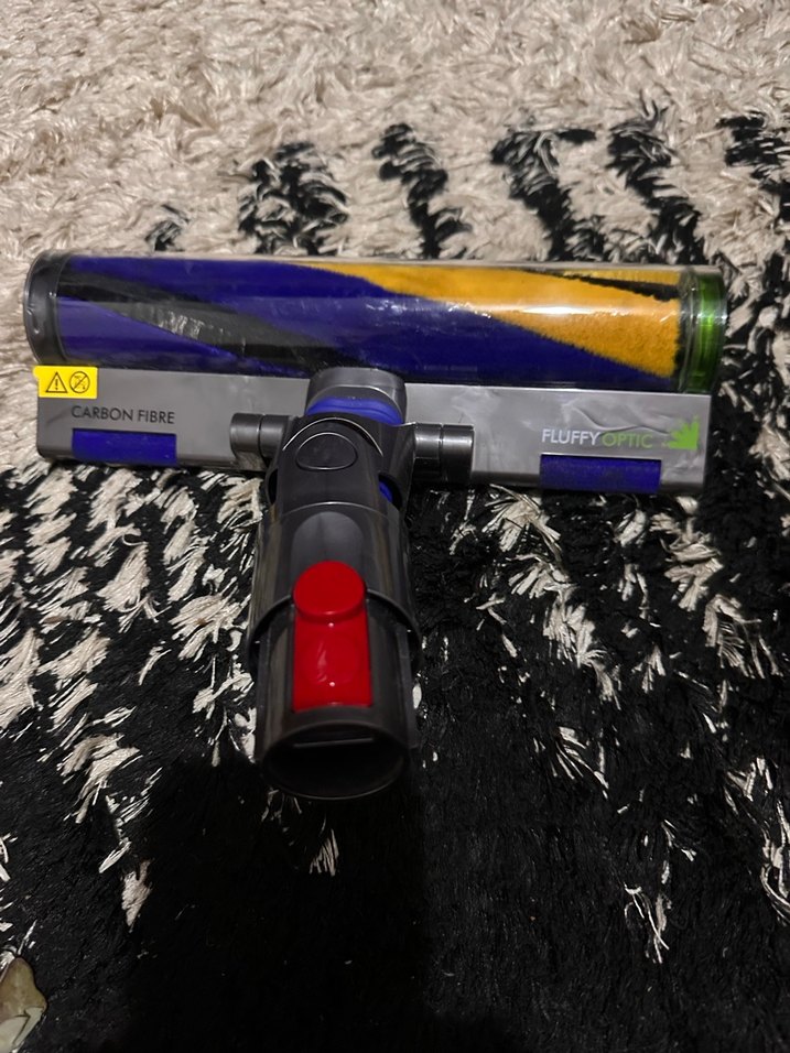 Karbon fiber ve fluffy optic teknolojisine sahip koyu gri vakum temizleyici başlığı, etkili temizlik sağlar.