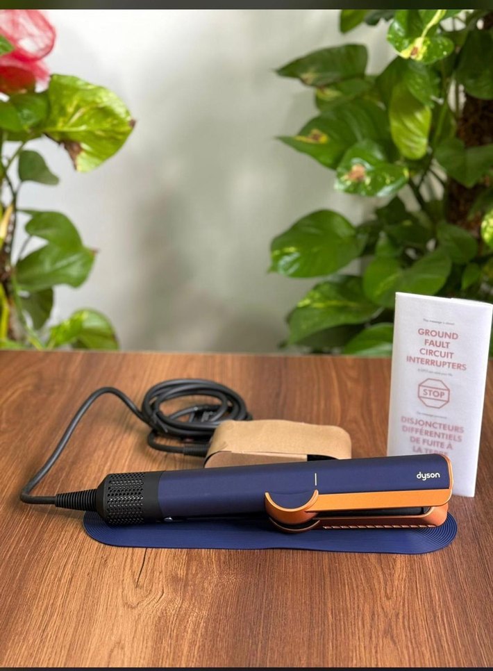 Koyu mavi renkli Dyson saç düzleştirici, şık tasarımı ve ısıtma plakası ile etkili saç şekillendirme sağlar.