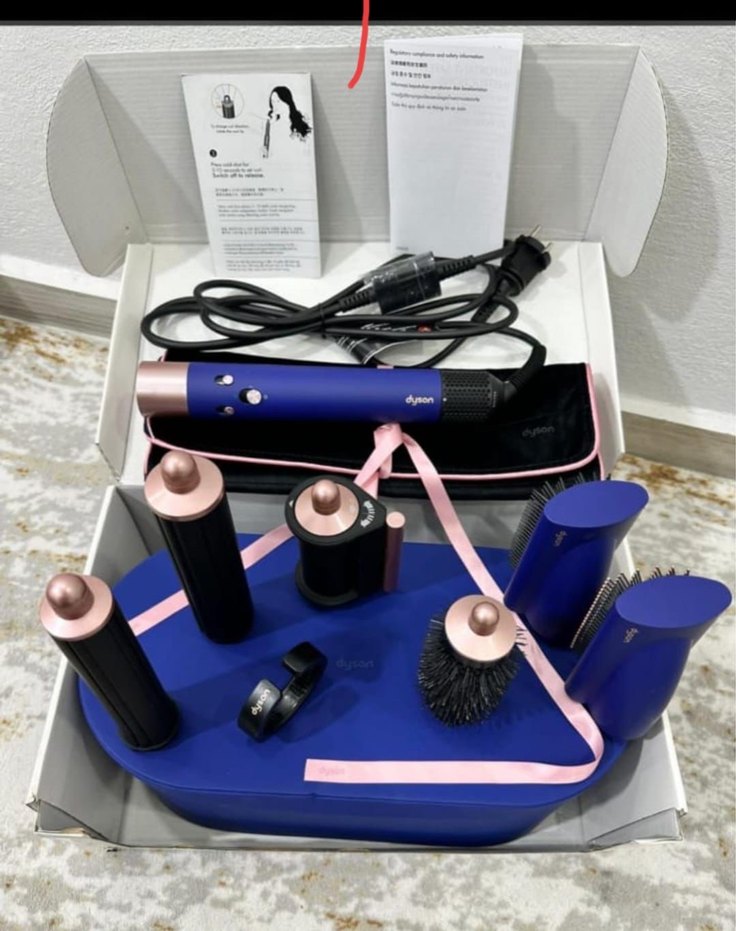 Dyson saç şekillendirici set, farklı saç stilleri için çoklu başlıklar içerir. Koyu mavi ana cihaz ve gül altın detaylar ile birlikte güç kablosu ve taşıma çantası bulunur. ♀️
