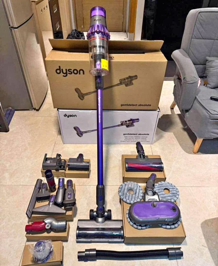 Çoklu aparatlar ve aksesuarlarla birlikte gelen koyu mor Dyson kablosuz elektrikli süpürge. Orijinal kutusunda.