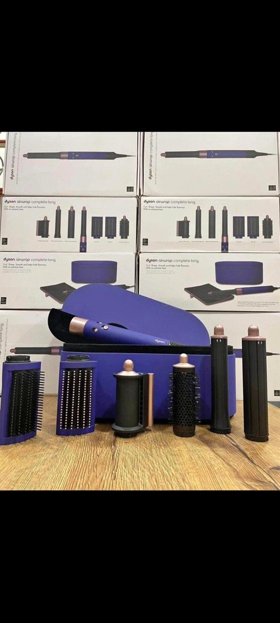 Dyson mor saç şekillendirici seti, çeşitli şekillendirme başlıkları ve mor taşıma kutusuyla birlikte gelir. ✨