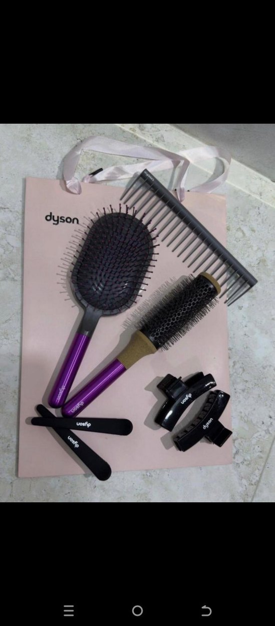 Dyson mor renkli saç fırçası, yuvarlak fırça, geniş dişli tarak ve saç tokalarından oluşan saç şekillendirici set.