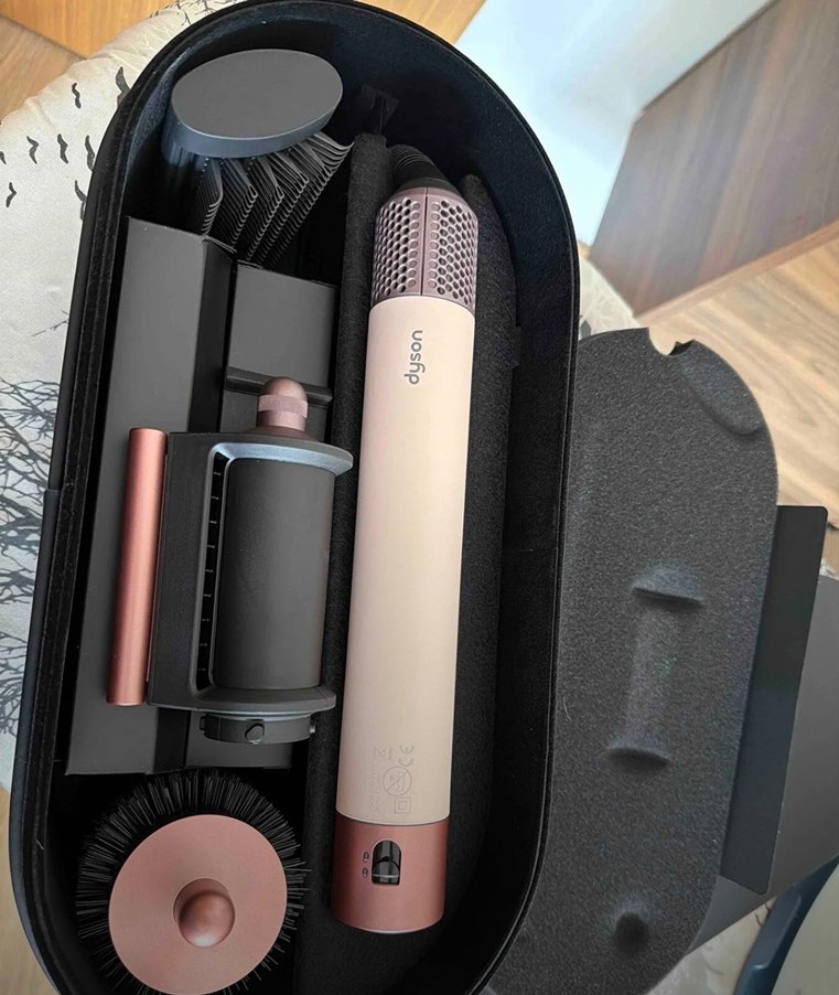 Dyson saç şekillendirici pembe renkte, çoklu aparatlar ile çeşitli şekillendirme seçenekleri sunar, şık siyah kutuda saklanır. ✨