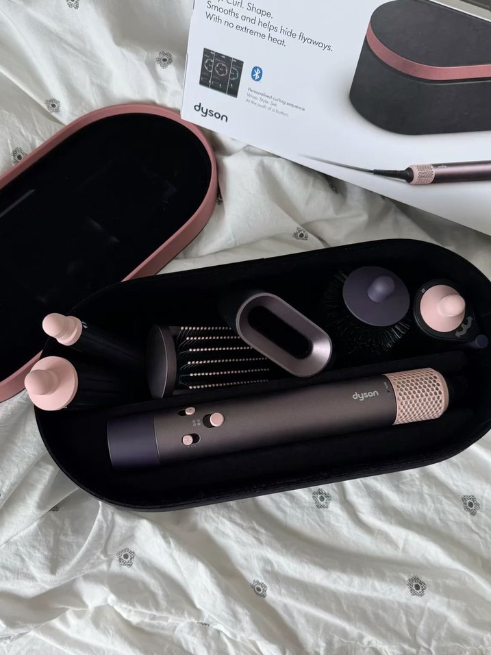 Dyson saç şekillendirici, kıvırma, şekillendirme ve saç düzleştirme için farklı başlıklarla birlikte gelir. Şık bej saklama kutusu dahildir.