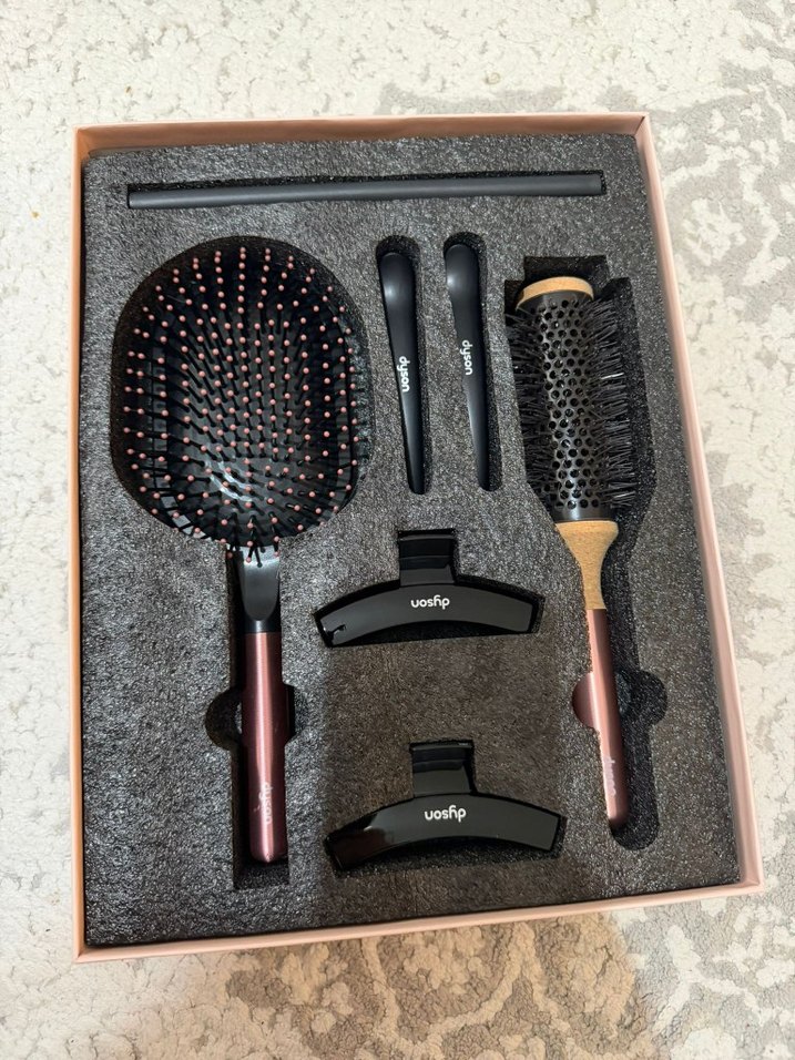 Dyson saç şekillendirici set, büyük yassı fırça, ahşap saplı yuvarlak fırça, iki saç tokası ve ince siyah şekillendirici içerir. ♀️