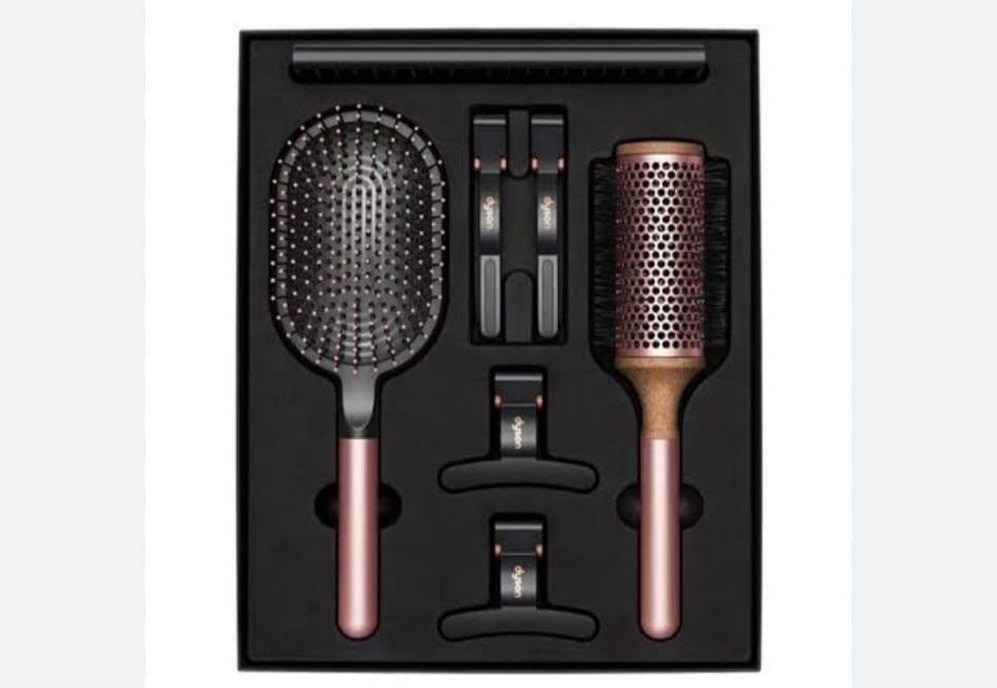 Dyson saç şekillendirici seti, geniş paddle fırça, yuvarlak fırça ve saç klipsleri içerir. Çok yönlü kullanım sağlar. ♀️
