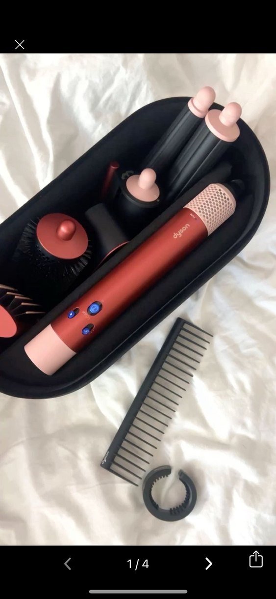 Çeşitli başlıklar ve siyah tarak içeren kırmızı Dyson saç şekillendirici seti. Siyah taşıma çantasıyla birlikte.Strawberry bronze rengi yenidir kullanmadım bende airstrait de var o yeterli oluyor maşa yapmadığım için