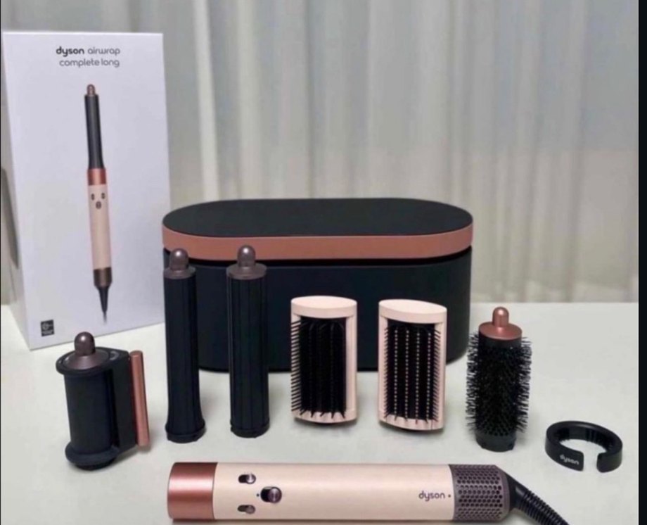 Dyson saç şekillendirici seti, çeşitli tarak başlıkları ve taşınabilir kutu ile kahverengi tonlarında. Çok yönlü kullanım sağlar. ✨