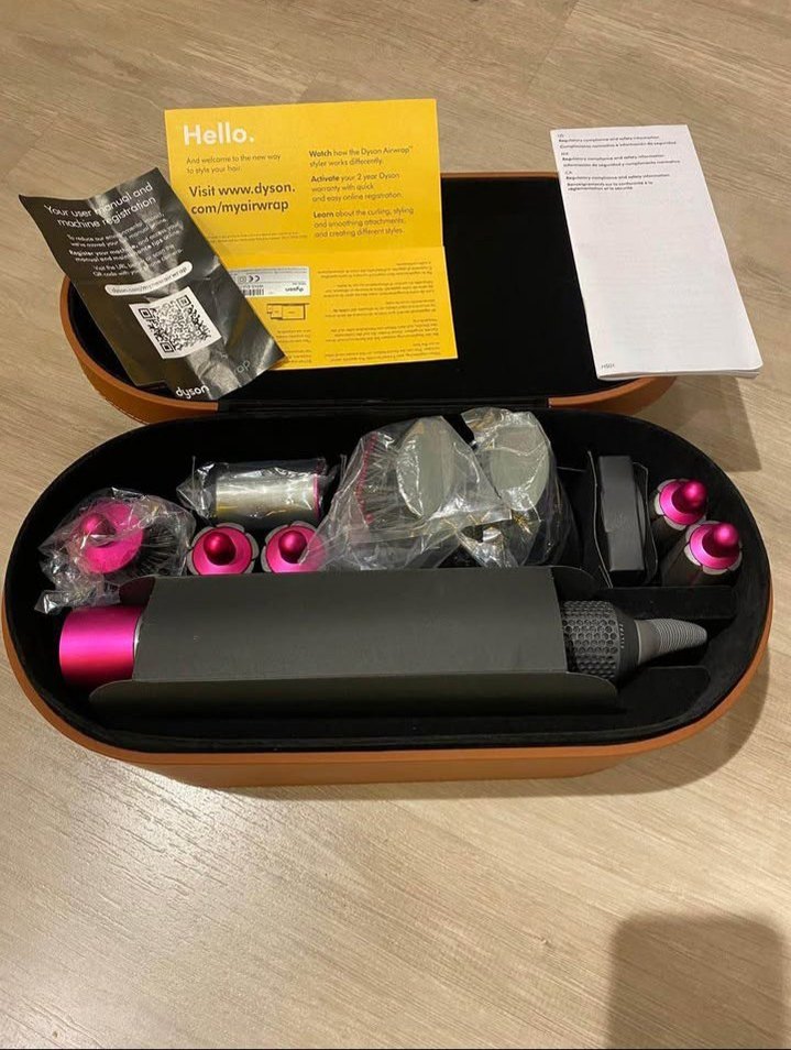 Dyson pembe saç şekillendirici seti, çeşitli başlıklar ve taşıma kutusuyla birlikte. Kullanım kılavuzları ve aksesuar parçaları içerir 17 ay garantisi devam ediyor