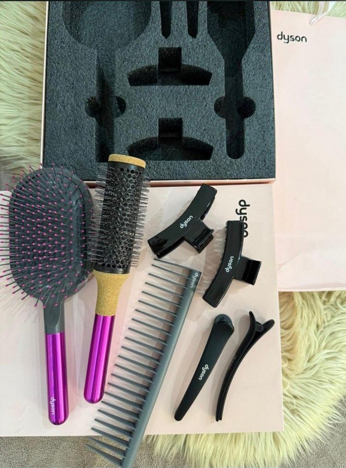 Dyson saç şekillendirici seti, pembe ve gri renkte çeşitli fırçalar, tarak ve saç tokaları içerir.