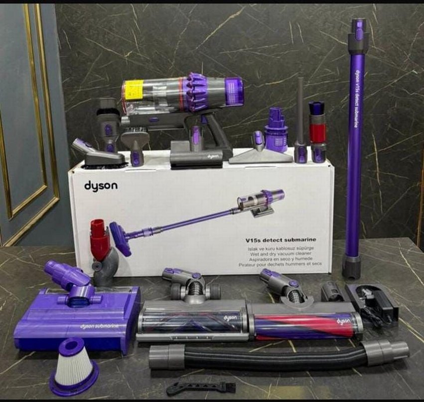 Kuru ve ıslak temizleme için çoklu aparatlar içeren koyu mor renkli Dyson elektrikli süpürge. Çeşitli yüzeyler için uygun. ithal ürün ve sıfırdır.