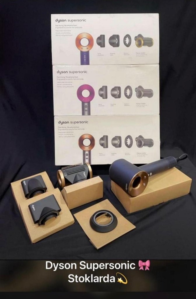 Dyson Supersonic saç kurutma makinesi, koyu kahverengi renkte, çeşitli başlıklarla birlikte gelir. Şık tasarıma ve güçlü kurutma performansına sahiptir. Stoklarda mevcut. ♀️