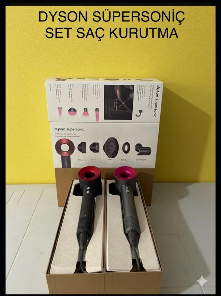 Dyson Supersonic set saç kurutma makinesi, koyu pembe renkte iki adet ve çeşitli aparatlarla birlikte gelir. Güçlü kurutma performansı sunar. ♀️