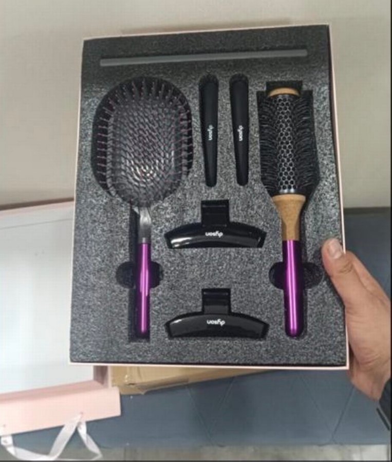Koyu mor renkte, geniş yastıklı fırça, yuvarlak fırça, iki saç tokası ve iki saç çubuğundan oluşan saç şekillendirici set. ✨