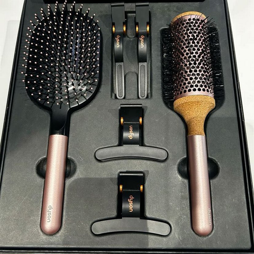 Dyson saç şekillendirici set kahverengi paddle ve yuvarlak fırça ile çeşitli aparatları içerir. Ergonomik saplara sahiptir.