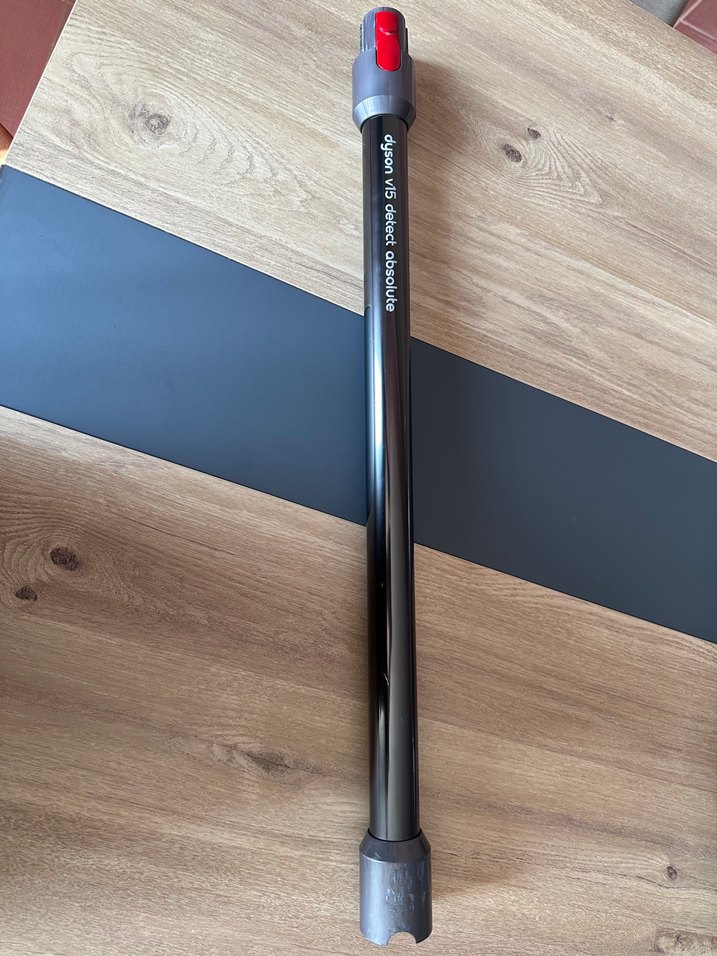 Koyu kırmızı Dyson V15 Detect Absolute vakum hortumu, şık tasarımlı ve kullanımı kolay kırmızı düğmeli. Çalışıyor sorun yok sadece görselde görünen çizikler var cihazın bozulduğu için satıyorum