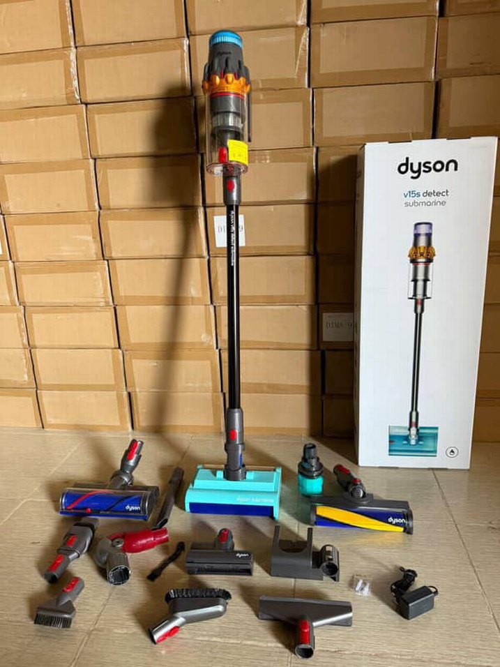 Dyson V15 Detect Submarine kablosuz süpürge, çoklu başlıklarla çeşitli temizleme seçenekleri sunar. Koyu ve çok renkli tasarıma sahip, toz algılama teknolojisi bulunur.