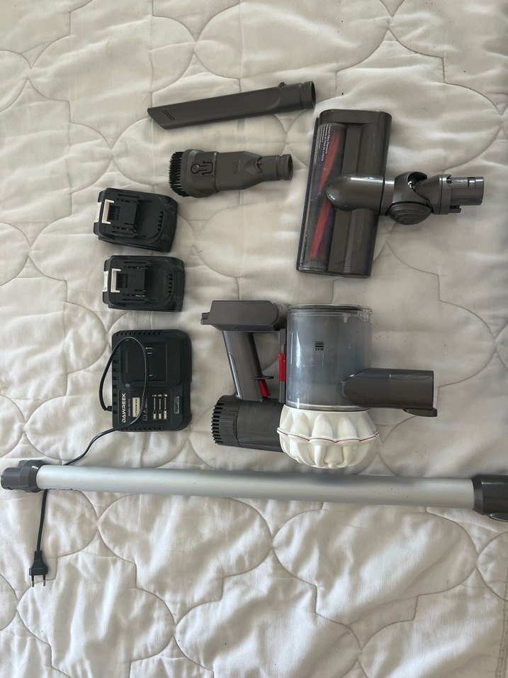 Çoklu başlıklar ve şarj istasyonu içeren gri kablosuz elektrikli süpürge seti. Fırça ve dar alan aparatları bulunur. Bütün bakımları yapılmış tertemiz V6 dyson tüm parçalar dahil 2 batarya 1 şarj cihazı dahil duvara asma aparatı dahil