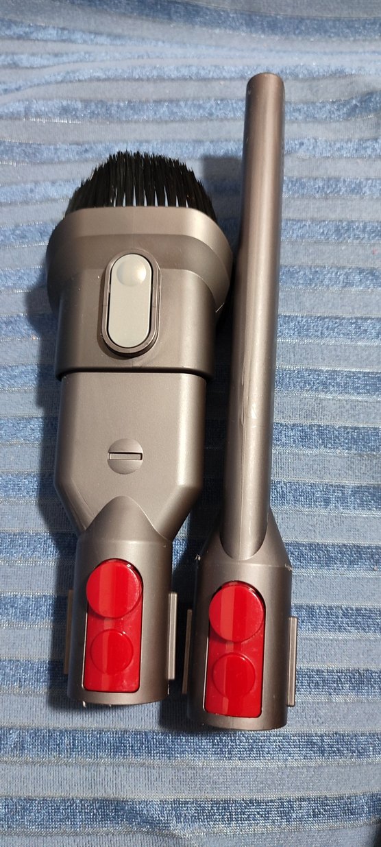#Dyson Kırmızı kilit düğmeli, fırça ve uzatma borusundan oluşan gri elektrikli süpürge aparat seti.