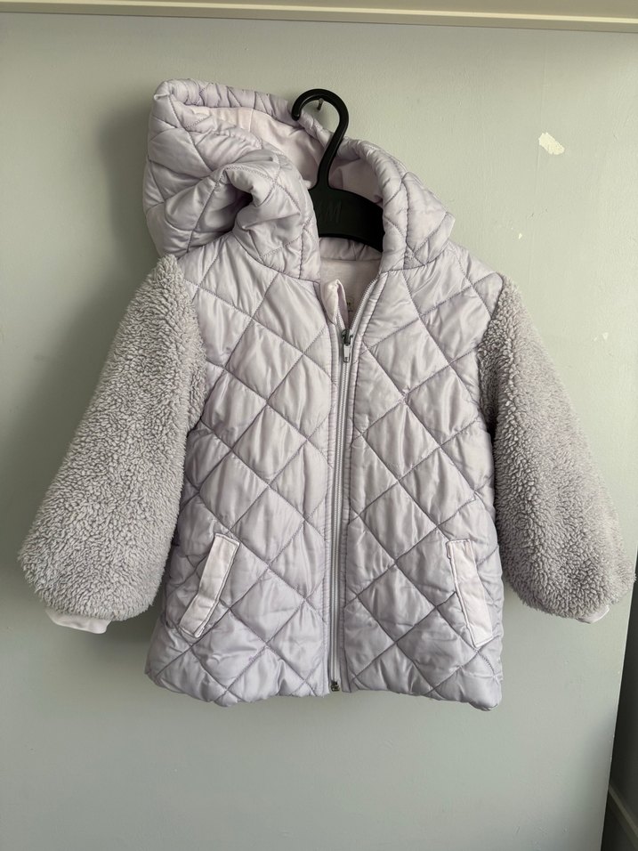 Kız çocukları için kapüşonlu, yumuşak dolgulu ve kürk detaylı kolları olan lila renkli mont tertemizdir 3-4 yaşa uyar