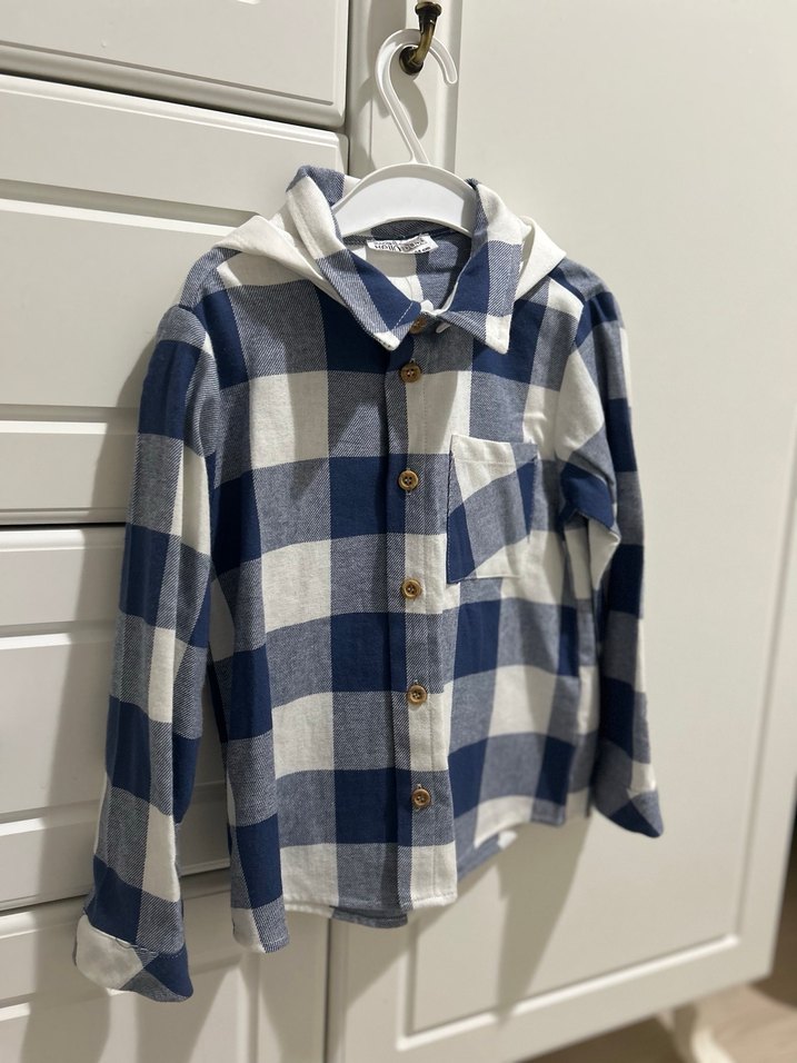 Erkek çocuk için uzun kollu, düğmeli, yakalı ve bol kesim gömlek. Pamuklu kumaştan, mavi ve gri kareli desenli, göğüs cebine sahip, rahat sokak stili için uygundur.