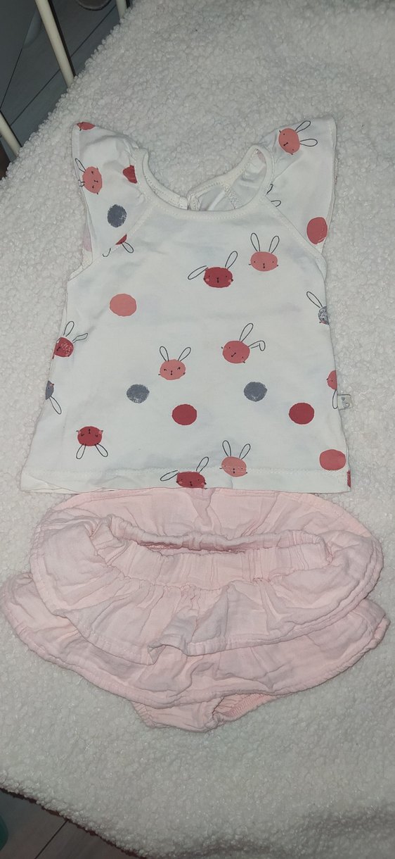 Kolsuz, fırfır detaylı şort bebek kız takımı. Üstü tavşan desenli, altı pastel pembe tie-dye etek. Bir iki kezgitilmiştir herhangi bir deformasyonu yoktur