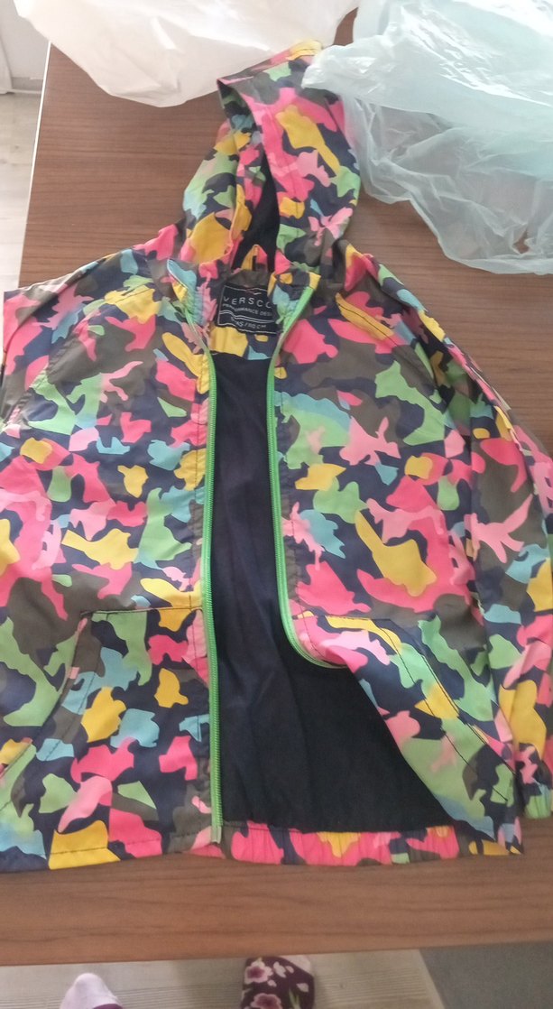 Renkli kamuflaj desenli, kapüşonlu ve fermuarlı kız ceketi. 4.5 yaş için