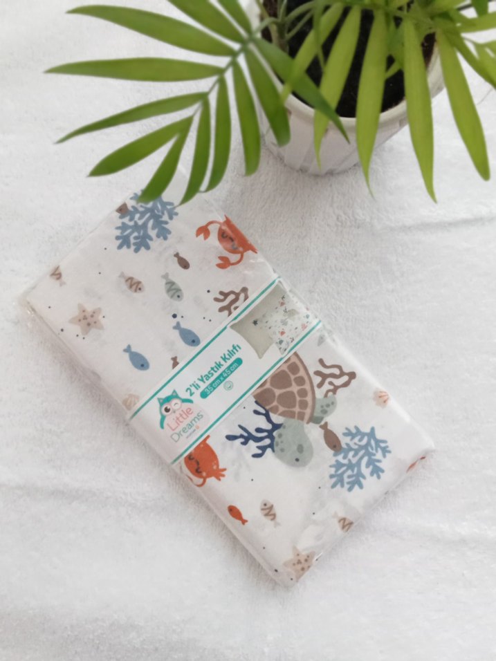 Pamuklu, beyaz zemin üzerine pastel renklerde deniz canlıları baskılı, yumuşak ve konforlu bebek yastık kılıfı.
