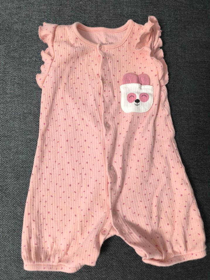 toz pembe renginde puantiyeli önünde küçük köpek desenli küçük bir cep detayi var. tamamen çıtçıtlıdır. 6 aylık kız bebekler için uygundur.