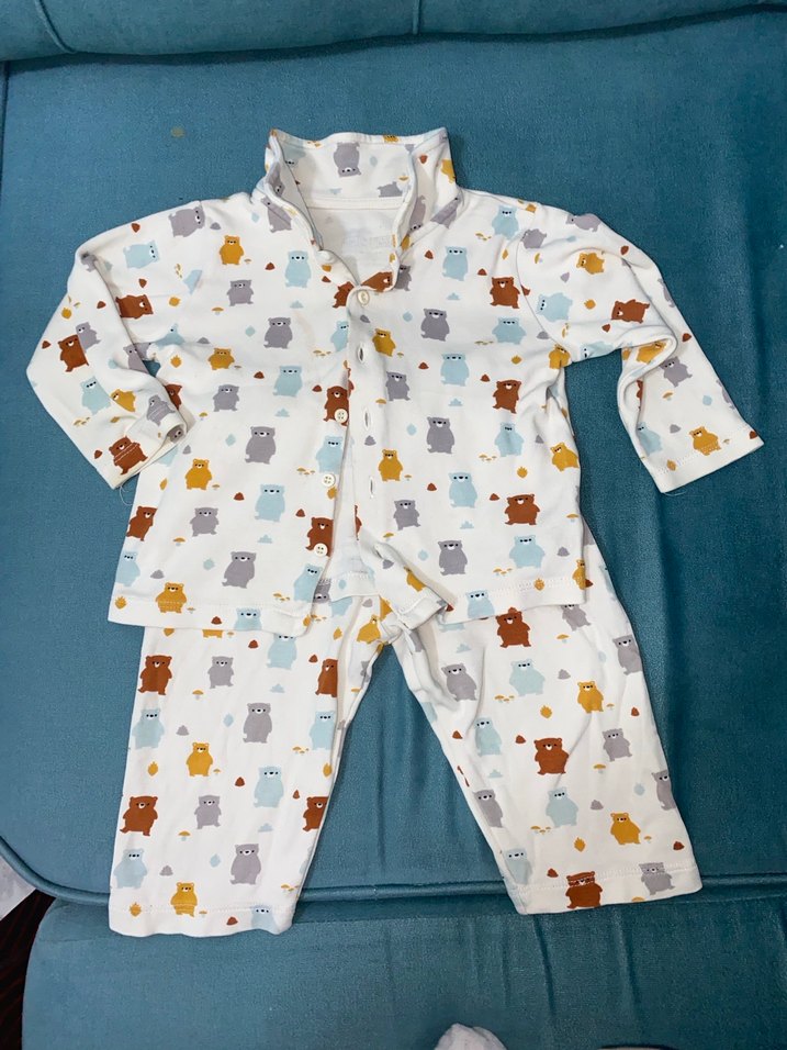 Uzun kollu ve düğmeli bebek pijama takımı yumuşak ve sıcak kumaştan üretilmiştir. Beyaz zemin üzerinde renkli baskılı desene sahiptir.