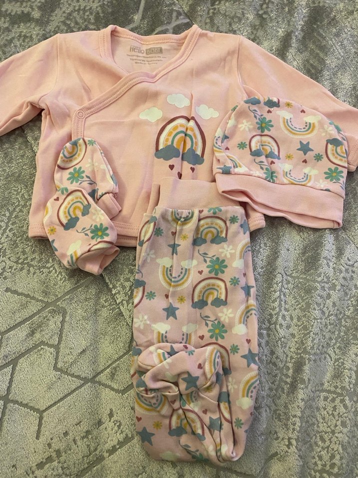 Pastel bağlama desenli, pembe renkli, uzun kollu örgü bebek kız takımı; üst, pantolon, eldiven ve şapka içerir. Kullanılmadı.