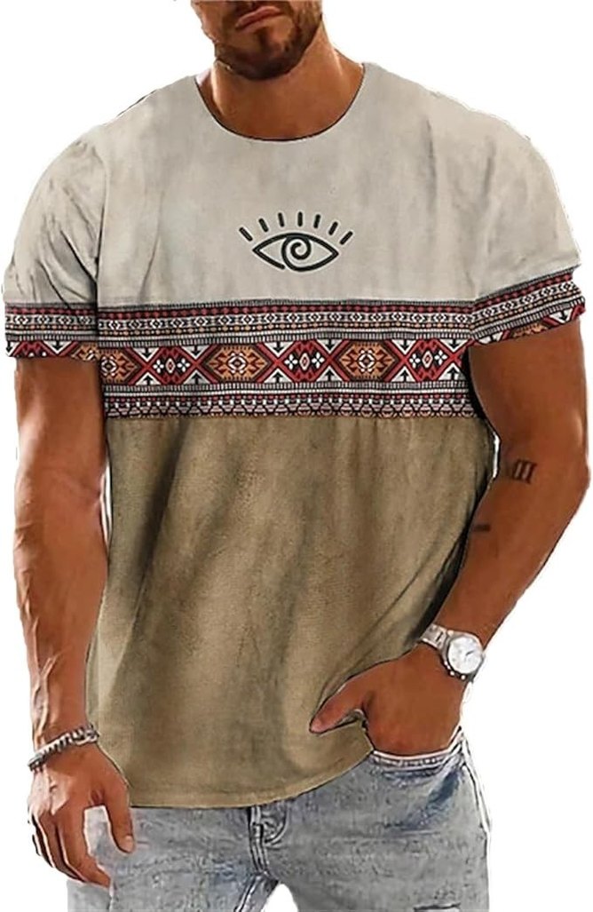 E106 Erkek Kısakol Tişört Aztec Desen Bej Kahve YURTDIŞI ÜRÜN... Bu erkek tişörtü, bol kesim, bisiklet yaka ve kısa kolludur. Göğüs kısmında kahverengi ve gri renklerde etnik desenler bulunur, rahat ve şık bir sokak stili sunar.