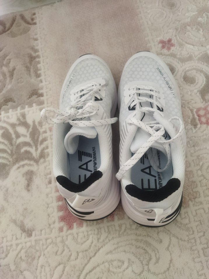 Beyaz EA7 Emporio Armani unisex spor ayakkabı, bağcıklı ve kauçuk tabanlıdır. Spor ve sokak stili için uygundur, rahat ve trend görünümlüdür.