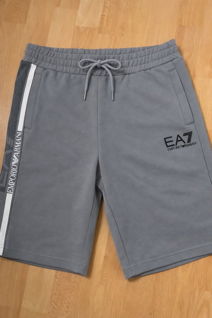 EA7 logolu, elastik bel bantlı gri erkek spor şort, yumuşak ve rahat kumaştan üretilmiştir.