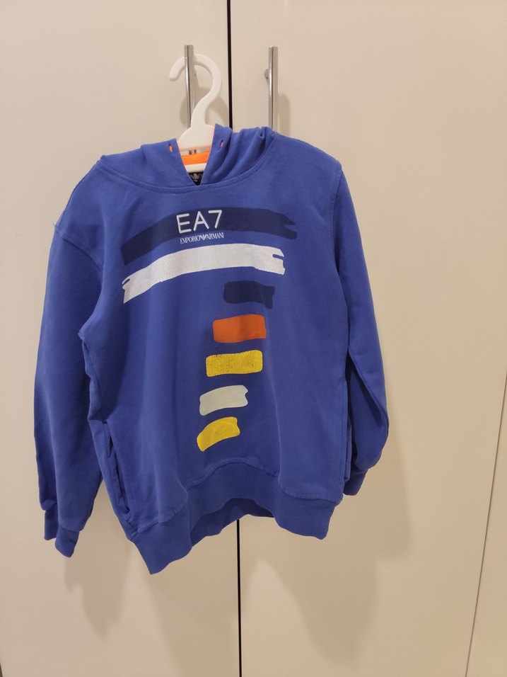 EA7 marka, mavi renkli, baskılı, uzun kollu, bol kesim erkek sweatshirt. Yumuşak kumaş ve elastik bel detayına sahiptir.