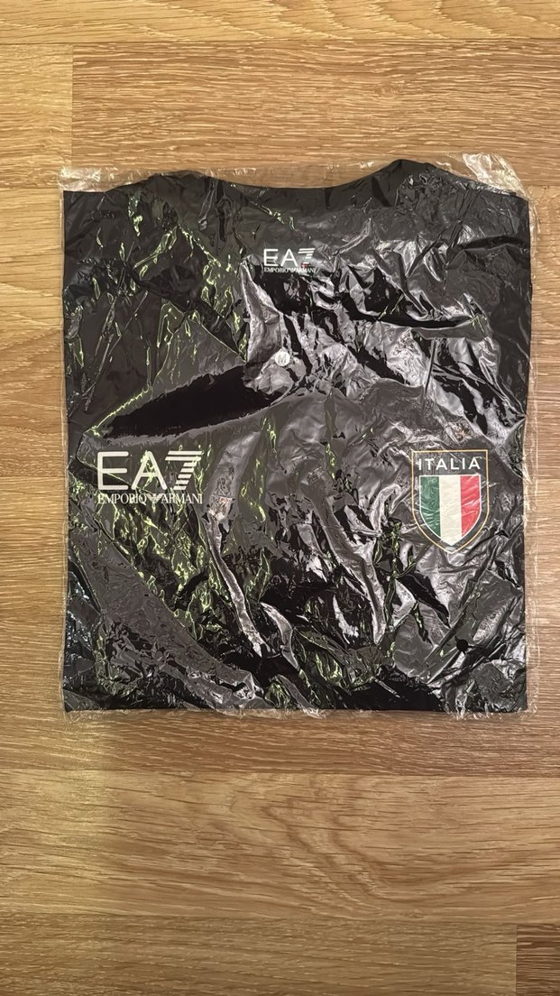 EA7 marka siyah, kapüşonlu ve kısa kollu, baskılı desenli erkek tişörtü. İnce kesim ve fermuarlı detay içerir, sokak ve spor tarzını yansıtır.