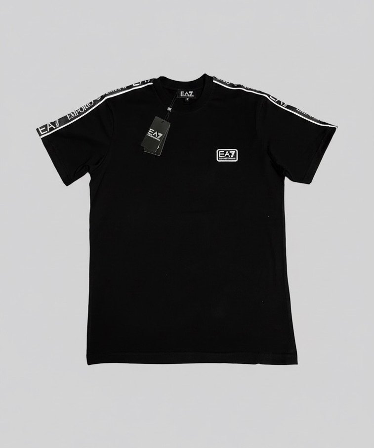 Bu siyah EA7 erkek tişörtü, kısa kollu ve yuvarlak yakalıdır. Pamuk kumaştan üretilmiş, omuzlarda baskılı marka detayları bulunur ve rahat bir kesime sahiptir. Spor ve gündelik kullanıma uygundur.
