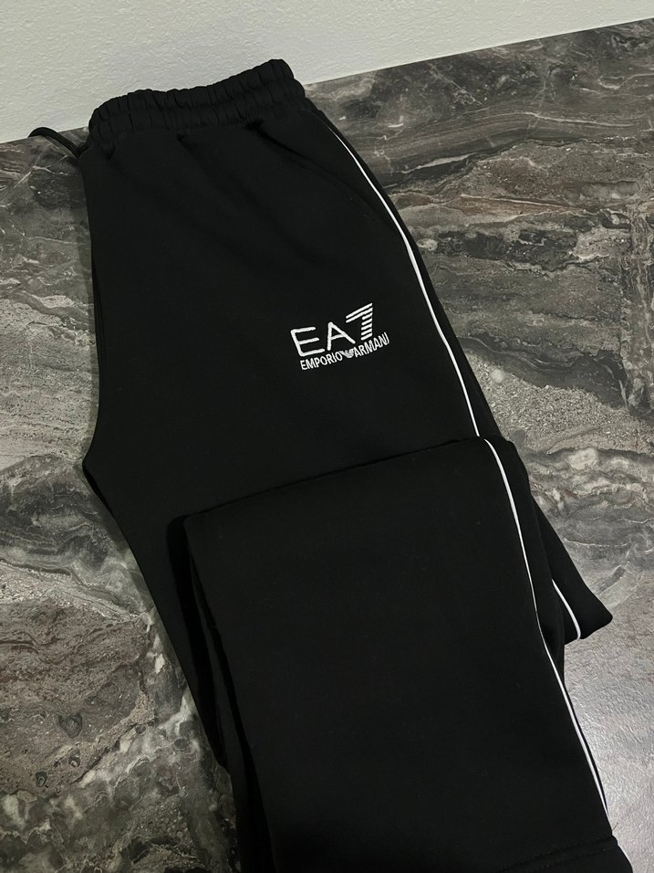 EA7 siyah, baskılı logolu, fermuarlı cepli, yumuşak kumaştan erkek eşofman altı. Sokak stili ve dış mekan için uygundur.