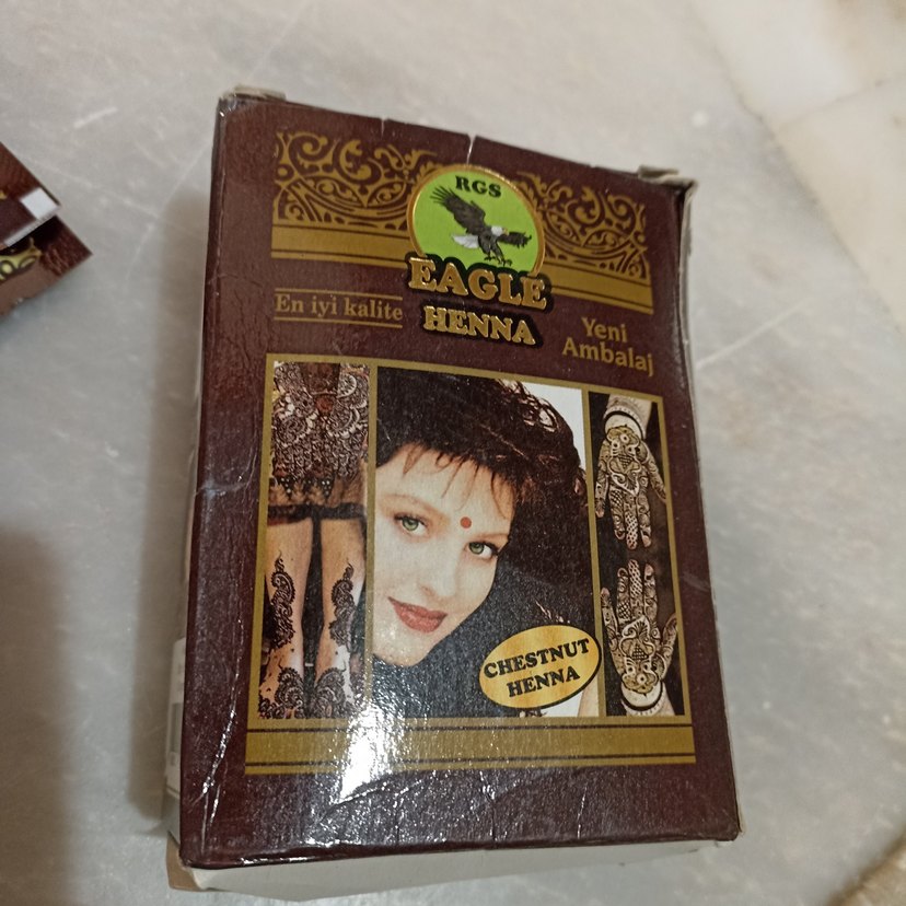 Eagle Chestnut Henna, yeni ambalajında yüksek kaliteli doğal saç boyasıdır. Saç ve kına desenleri için zengin kestane rengi sunar. tek fiyatı