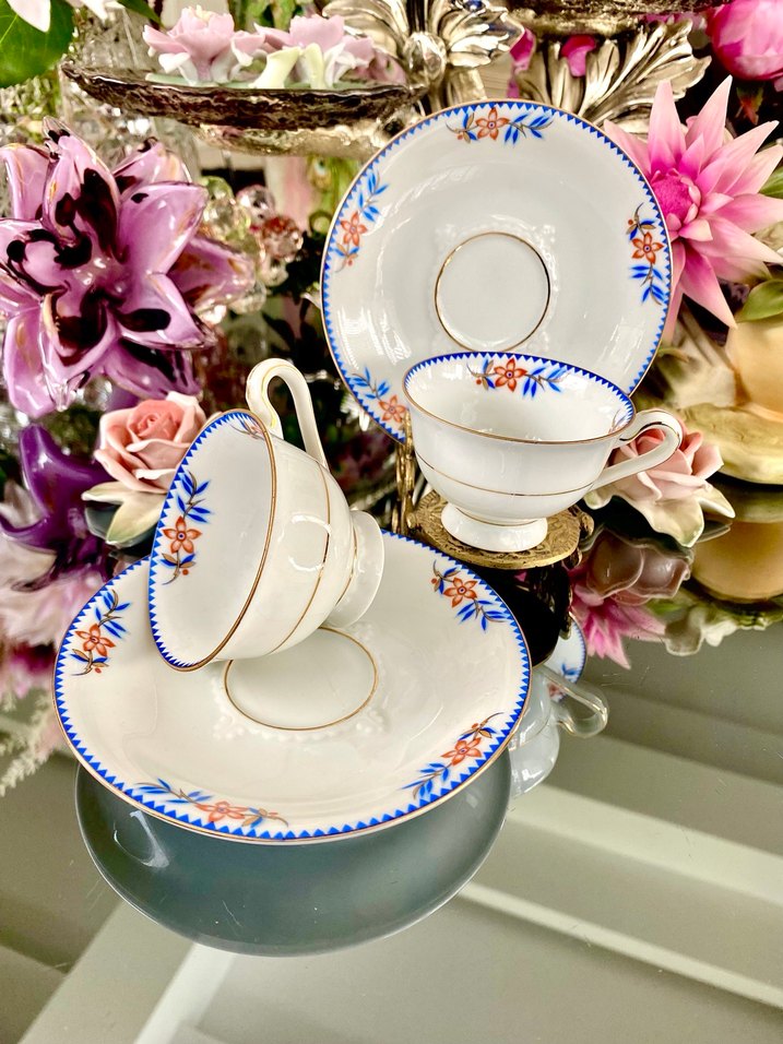 1927-1940 lar arası Almanya Bavaria bölgesinde üretilen, EAMAG Alt Schönwald damgalı, yumurta kabuğu inceliğinde kaliteli porselene sahip, estetik pedestal ayaklı form yapısı, kobalt mavi zigzag (chevron) bordür detaylar, turuncu/kırmızı stilize çiçek motiflerle dekore edilmiş, altın işlemelerle süslenmiş, çok zarif, koleksiyonluk bir antika fincan seti. Türk kahve boyudur. Ölçüleri: Fincan ağız çapı : Ø 6,9 cm., boy 4,6 cm., tabak çapı: Ø 12 cm. 1 ADET FİYATIDIR, çifti de mevcuttur. Ürün kodu:0694 İADE ve DEĞİŞİM YOKTUR #eamag #AltSchönwald #Schönwald #fincan #kahve #türkkahve #kahveseti #koleksiyon #antika #vitrin #dekor #sunum #hediye