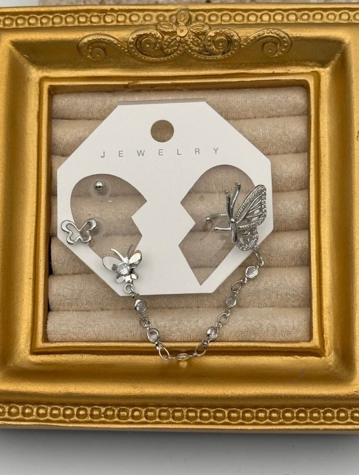 Kelebek ve çiçek detaylı, zincirle bağlı kısa uzunlukta gümüş renkli küpe. Minimalist ve bohem tarzda günlük kullanıma uygun.