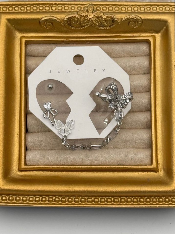 Kelebek ve fiyonk figürlü zincir detaylı kısa gümüş renk earcuff küpe seti
