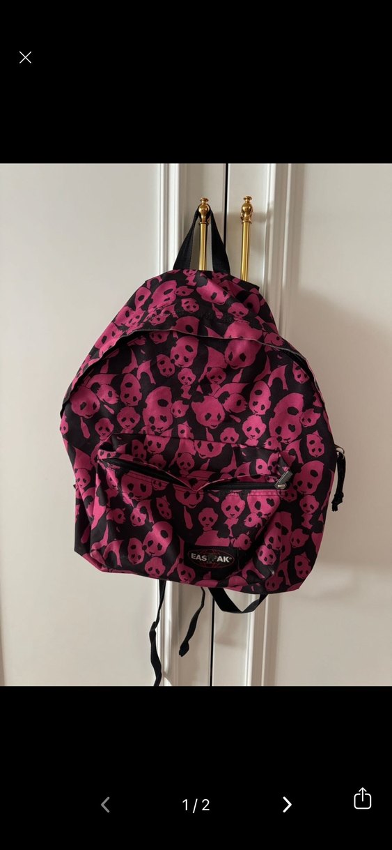 Sentetik kumaştan, pembe panda desenli ve tokalı detaylara sahip koyu renkli sırt çantası. Günlük kullanım için uygun grunge punk tarzı. eastpak yazan yerde kuck bi iz var sadece onun disinda saglam temiz urun