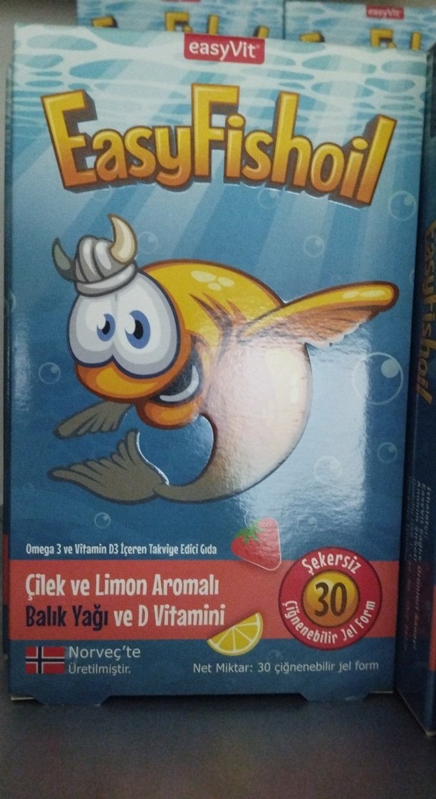 EasyFishoil çilek ve limon aromalı, balık yağı ve D vitamini içeren şekersiz 30 çiğnenebilir jel formu. Norveç'te üretilmiştir.