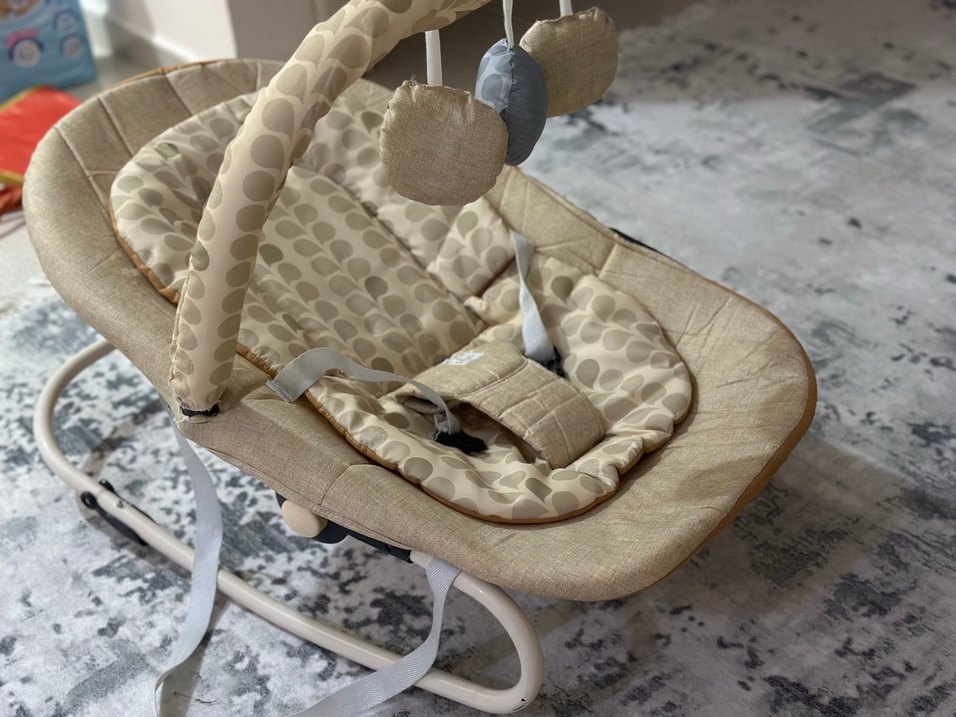 Yumuşak desenli kumaş ve asılan peluş oyuncaklara sahip bej ve gri bebek beşiği, bebeklerin rahatlaması için uygundur.1 ay falan kullanıldı bebeğim büyüdüğü için artık kullanamıyoruz makul fiyata koyuyorum alacak olanın da işini görsün inşallah