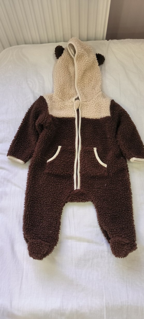 Yumuşak, polar kumaştan yapılmış kahverengi ve krem tonlarında bebek tulumu. Kapüşonlu, önden fermuarlı ve ceplidir.