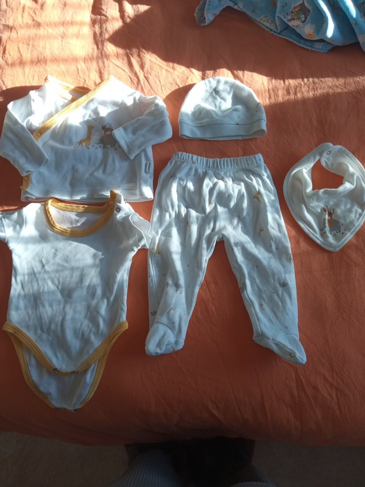 Yumuşak sentetik kumaştan yapılmış, beyaz uzun kollu üst, pantolon, şapka, body ve önlük içeren bebek erkek kıyafet takımı. bebeğime iki ay giydirdim yeni gibi. ebekten alındı.