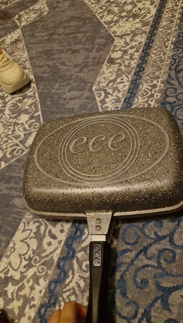 ECE markalı, Türkiye'de üretilmiş gri granit kaplamalı çift taraflı tava, sağlam saplı ve dayanıklı yapıda, çok amaçlı kullanım için uygundur.